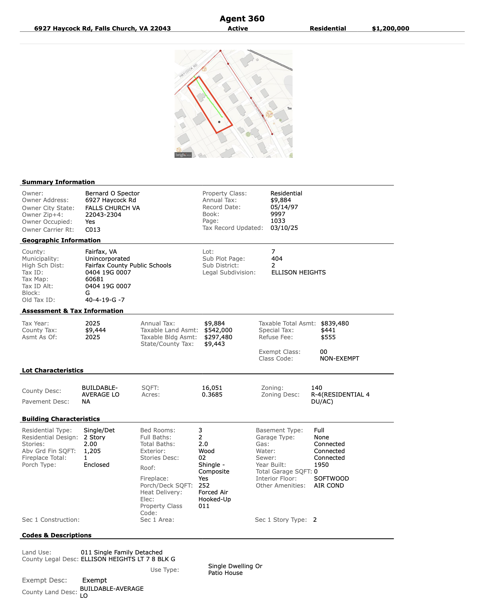 Exceptional Tear-Down Opportunity in Ellison Heights | 0.50 Acres Across Two Parcels. Tax ID# 40-4-19-G -9 (0.14a / 6237sf) MLS#VAFX2241422 and Tax ID#0404 19G 0007 (0.3685/16,051sf) On the market for the first time in 75 years, this rare half-acre offering in Ellison Heights presents a true blank canvas for investors, builders, and visionaries. Comprised of two separate parcels totaling approximately 0.50 acres, this property offers the choice of two buildable lots—a unique opportunity in a neighborhood where new construction continues to thrive. Builder has the freedom to make boundary line adjustment to ensure the highest and best use of both lots. Situated in Fairfax County, this distinguished neighborhood features a mix of recently built homes and offers residents an ideal combination of comfort, elegance, and prime location. Access is available from both Haycock Road and Highland Terrace, offering flexibility for future site planning. The existing home is not being marketed for its livability and is being sold *strictly "As-Is, Where-Is." All offers must include the NVAR Contingencies/Clauses Addendum with the "As-Is" clause. Just 10 min from the new Asian food hall in Falls Church’s Eden Center!! Check out the newly opened Pop Up District. Nestled in a prime location, you’re just minutes from the West Falls Church Metro, WO&D Trail, and major commuter routes. Enjoy close proximity to Arlington, McLean, and Tysons, along with access to the highly rated Fairfax County Public Schools: Haycock Elementary, Longfellow Middle, and McLean High School. Whether you're envisioning two luxury residences or one expansive estate home, this lot provides a rare combination of location, flexibility, and long-term value. Opportunities like this are few and far between in such a well-established and connected community. Bring your builder, your architect, or your vision—and take advantage of the unmatched potential this property has to offer.