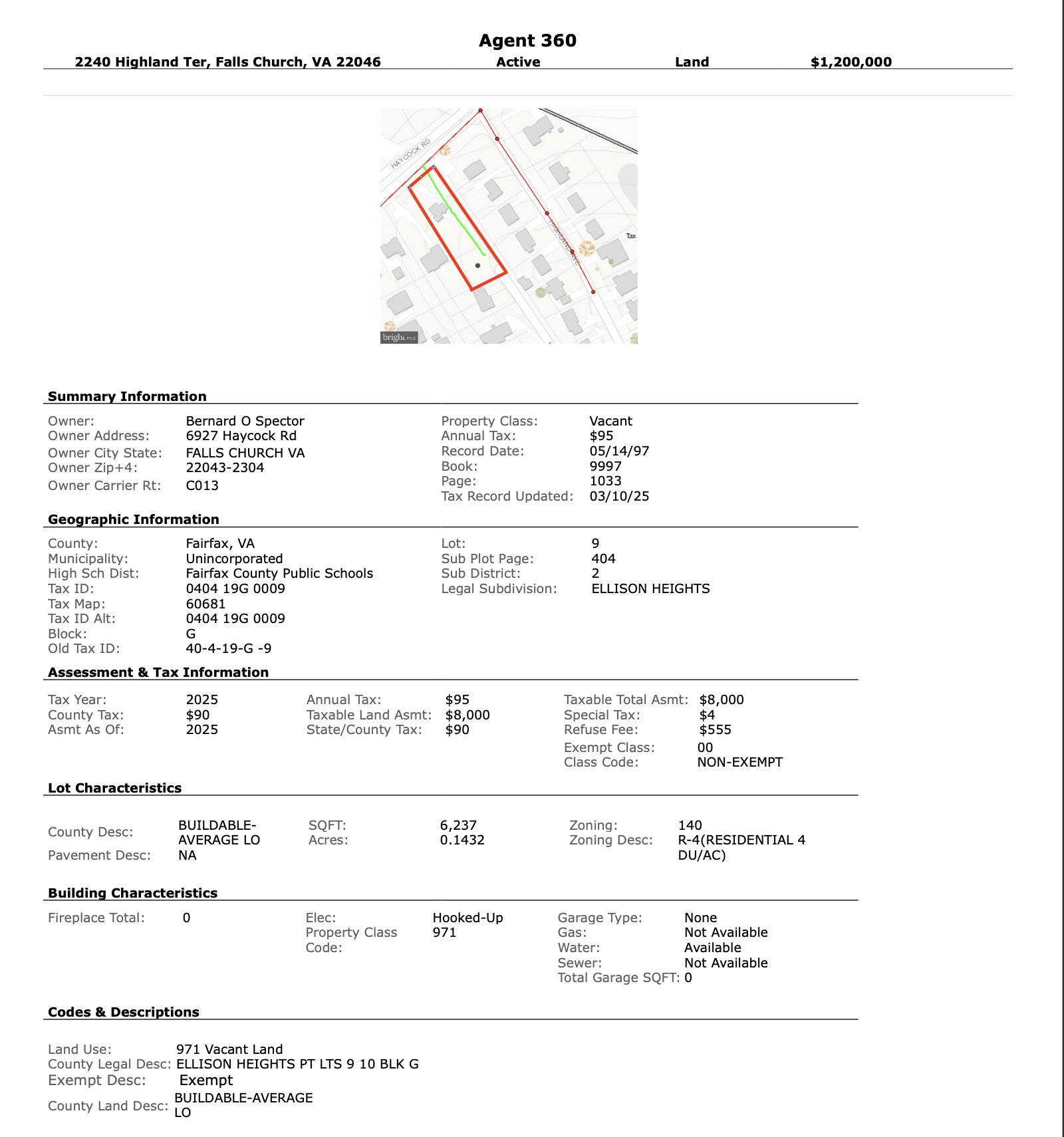 Exceptional Tear-Down Opportunity in Ellison Heights | 0.50 Acres Across Two Parcels. Tax ID# 40-4-19-G -9 (0.14a / 6237sf) MLS#VAFX2241422 and Tax ID#0404 19G 0007 (0.3685/16,051sf) On the market for the first time in 75 years, this rare half-acre offering in Ellison Heights presents a true blank canvas for investors, builders, and visionaries. Comprised of two separate parcels totaling approximately 0.50 acres, this property offers the choice of two buildable lots—a unique opportunity in a neighborhood where new construction continues to thrive. Builder has the freedom to make boundary line adjustment to ensure the highest and best use of both lots. Situated in Fairfax County, this distinguished neighborhood features a mix of recently built homes and offers residents an ideal combination of comfort, elegance, and prime location. Access is available from both Haycock Road and Highland Terrace, offering flexibility for future site planning. The existing home is not being marketed for its livability and is being sold *strictly "As-Is, Where-Is." All offers must include the NVAR Contingencies/Clauses Addendum with the "As-Is" clause. Just 10 min from the new Asian food hall in Falls Church’s Eden Center!! Check out the newly opened Pop Up District. Nestled in a prime location, you’re just minutes from the West Falls Church Metro, WO&D Trail, and major commuter routes. Enjoy close proximity to Arlington, McLean, and Tysons, along with access to the highly rated Fairfax County Public Schools: Haycock Elementary, Longfellow Middle, and McLean High School. Whether you're envisioning two luxury residences or one expansive estate home, this lot provides a rare combination of location, flexibility, and long-term value. Opportunities like this are few and far between in such a well-established and connected community. Bring your builder, your architect, or your vision—and take advantage of the unmatched potential this property has to offer.